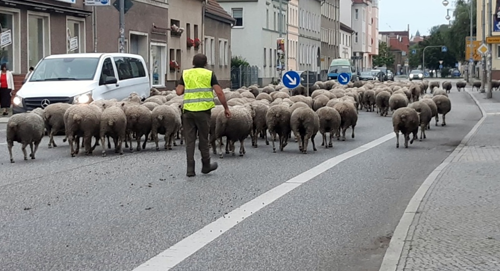 Havelland – und in der Funkstadt Nauen war wieder was los, nur damit rechnete heute am späten Nachmittag der Nauener Andy aber nicht. Das Ziel nach Feierabend war eine leckere Wurst schnell am Imbiss in der Dammstraße, das musste dann aber verschoben werden, es wurde nämlich im Straßenverkehr plötzlich still, dafür tierisch. Ein Schäfer mit seiner Herde Schafe passierte die Dammstraße aus Richtung Waldsiedlung. Der Kreisverkehr kam in weiterer Folge erstmal zum Erliegen. Der Nauener sowie auch andere, zückten die Handys.