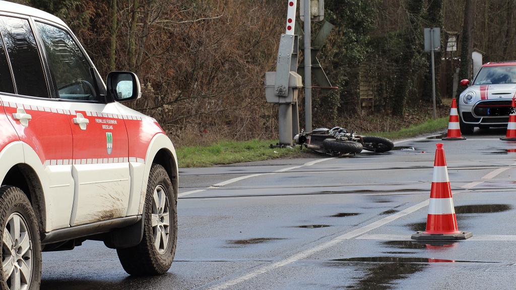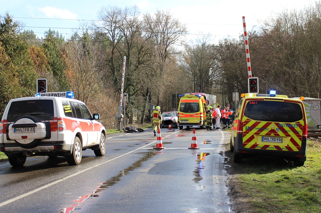Landkreis Havelland, Brieselang, Nauener Chaussee, Bahnübergang - Kradfahrer kollidiert mit Zug - Freitag, 08.03.2019, 13:21 Uhr - An einem beschrankten Bahnübergang in Brieselang, Nauener Chaussee kam es heute Nachmittag gegen 13:21 Uhr zu einem schweren Unfall zwischen einem Motorradfahrer und einem Zug. Der Kradfahrer wurde aus bislang nicht geklärten Umständen von einem durchfahrenden Zug erfasst und so schwer verletzt, dass er noch vor Ort seinen Verletzungen erlag. Die Polizei leitete ein Todesermittlungsverfahren ein.