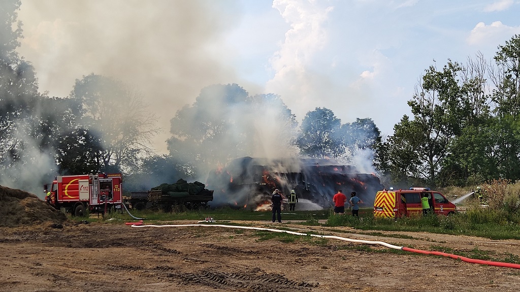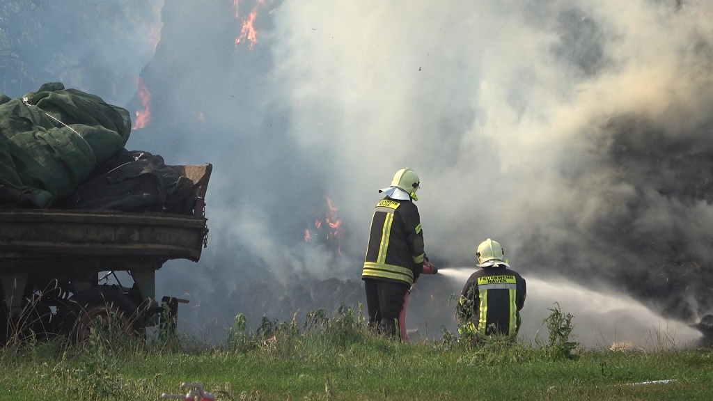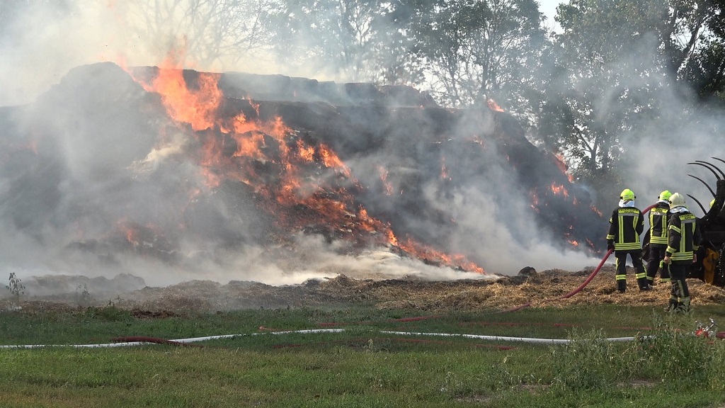 Nachtrag:18.04 Uhr / Wie die Feuerwehr vor Ort mitteilte brannten etwa 240 Ballen Stroh. Die Strohmiete wird im weiteren Verlauf kontrolliert herunter brennen.