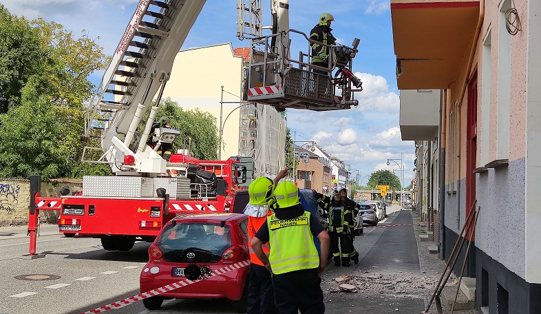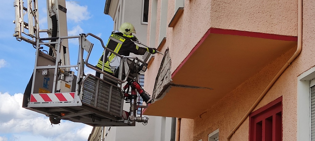Havelland: Aus bisher noch ungeklärter Ursache ist heute Nachmittag von einem geschlossenen Balkon eines Wohnhauses in der Dammstraße/B 273 der Putz heruntergebrochen und landete dabei auf dem Bürgersteig, wie durch ein Wunder kamen keine Menschen dabei zu schaden. Die Feuerwehr der Stadt Nauen kam zum Einsatz und sicherte vorerst die Gefahrenstelle sowie eine Fahrbahnseite. Unter Einsatz eines Leiterwagens wurden der restliche noch lockere Putz von verschlossen Balkon entfernt.