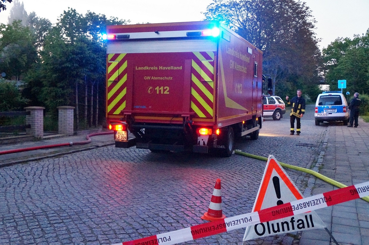 Kreis Havelland: Ehemaliges Kitagebäude Teil eines Gebäudekomplexes in Premnitz am Abend in Flammen aufgegangen.
