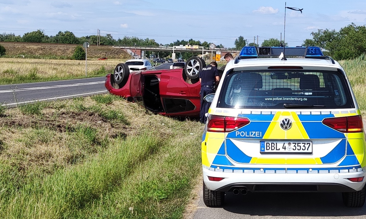 Havelland: Aus bislang noch ungeklärter Ursache kam heute Nachmittag ein PKW Nissan bei Falkensee nach einem Bremsvorgang auf ca. 30 Meter Länge nach rechts von der Fahrbahn ab und überschlug sich anschließend, bis er auf dem Dach liegend zum Stehen kam. Der Fahrzeugführer (74) wurde dabei verletzt.