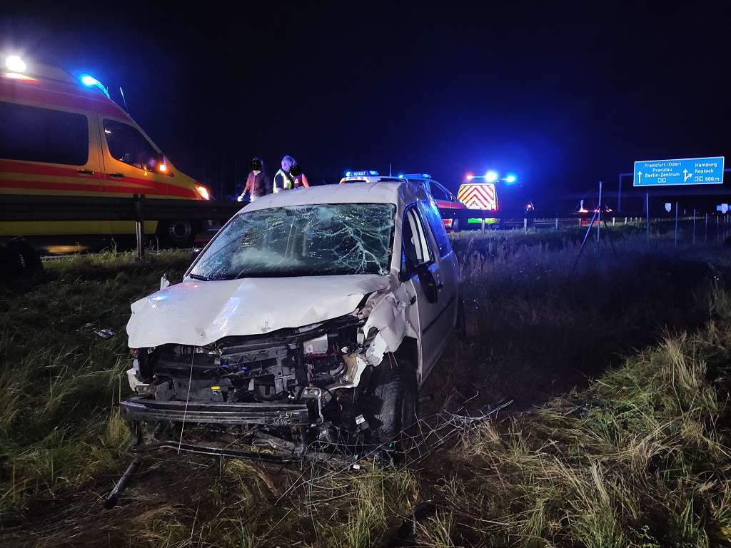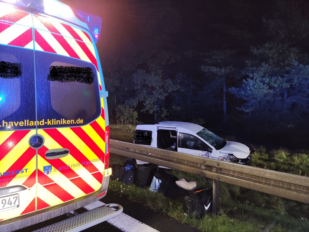Verkehrsunfall in der Gemeinde Oberkrämer (Oberhavel) – vermutlich war der Fahrer eines Firmenwagens kurz mit dem Navigationsgerät abgelenkt als er am späten Donnerstagabend zwischen der Anschlussstelle Falkensee (Havelland) und dem Autobahndreieck Havelland nach recht von der Fahrbahn ab kam. Der Caddy mit vier Insassen durchbrach dann den Wildschutzzaun und demolierte dabei rund 150 Meter als er mehrfach, gegen die die Umzäunung prallte, der VW Caddy kam anschließend auf die Seite zum Stehen.