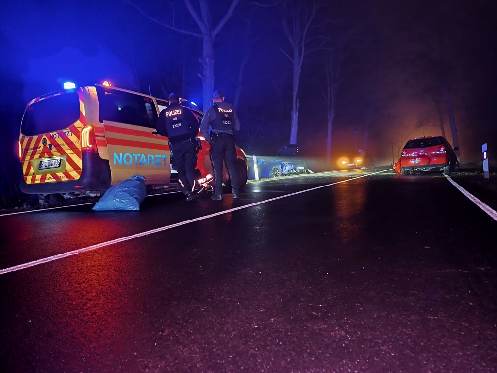 Havelland – aus noch ungeklärter Ursache verlor am späten Samstagabend (20.12.2025) der Fahrzeugführer die Kontrolle über den PKW VW Polo auf der L201 zwischen Brieselang und Falkensee, was einen Zusammenstoß mit einem Auto auf der Gegenfahrbahn hinter dem Kurvenbereich zur Folge hatte. Polizei, Feuerwehr, Rettungskräfte sowie der Bergungsdienst kamen zum Einsatz. Bei dem Verkehrsunfall wurden mindestens zwei Personen verletzt. Beide Unfallfahrzeuge wurden durch den heftigen Crash völlig zerstört.