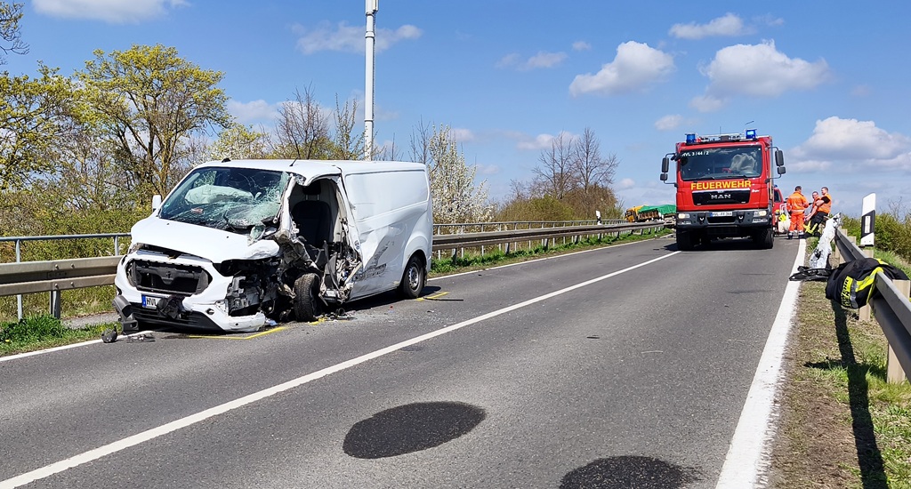 Havelland - Zu einem folgenschweren Verkehrsunfall kam es heute Mittag auf der L 86 zwischen Markee und dem Abzweig nach Neugarten (Stadt Nauen). Ein Transporter war aus noch unbekannter Ursache auf der ICE-Brücke nach links von der Fahrbahn abgekommen, sodass es zu einer heftigen Kollision mit einem im Gegenverkehr befindlichen Lastwagen gekommen ist. Der Kleinwagen wurde, ist anschließend die Leitplanke bis auf etwa 250 Meter noch entlang geschliffen bis er dann zum Stehen kam. Einsatzkräfte der Nauener Feuerwehr mussten mit schwerem Gerät ran um den eingeschlossenen Fahrzeugführer (22) aus dem völlig zerstörten Fahrerraum retten zu können.