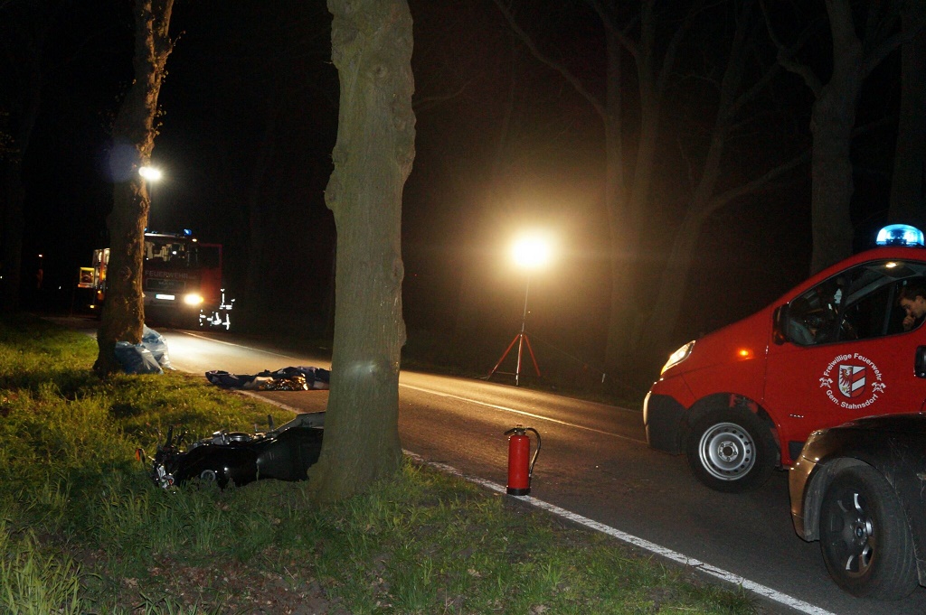 Nachtrag - 19.04.2016, 23.26 Uhr Ein 50 Jahre alter Motorradfahrer ist Dienstagnacht auf der Landstraße zwischen den Ortslagen Sputendorf und Schenkenhorst tödlich verletzt worden. Nach bisherigen Erkenntnissen stieß der 50-jährige mit seinem Krad Suzuki mit einem, über die Fahrbahn querenden Rehwild zusammen und kam in der weiteren Folge mit seinem Krad zu Fall. Ersthelfer versorgten den verletzten Mann noch bis Eintreffen der Rettungskräfte. Für den Potsdam-Mittelmärker kam jede Hilfe zu spät, er erlag noch an der Unfallstelle seinen schweren Verletzungen.