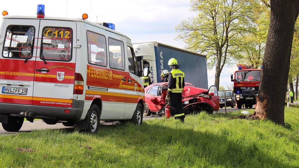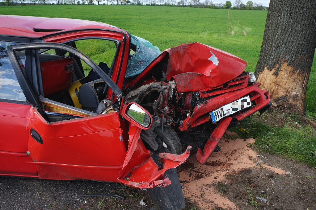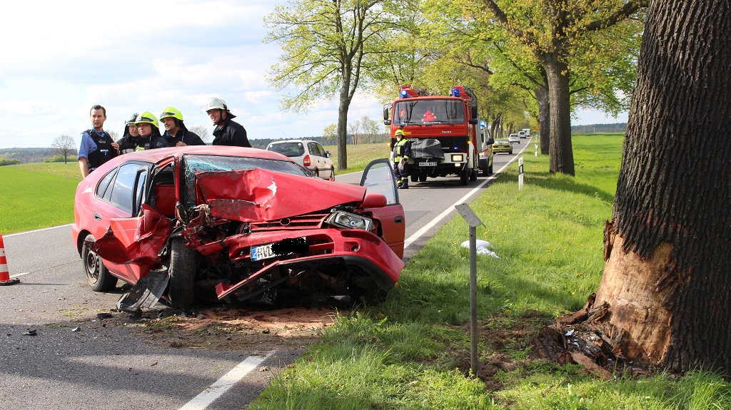 Kurzmeldung ++ Havelland ++ Zu einem Unfall mit einer Verletzten Person kam es Mittwochnachmittag auf der Bundesstraße 5 zwischen dem Abzweig Haage und Briesen (Gem. Mühlenberge). Aus bisher noch ungeklärter Urache kam der PKW Toyota in Fahrtrichtung Friesack nach rechts von der Fahrbahn ab und kollidierte mit einem Baum.