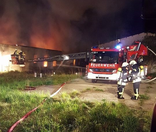 Landkreis Potsdam-Mittelmark, Wiesenburg, Schultze-Delitzsch-Straße - Brand in Reifenlager - 06.05.2016, 00.22 Uhr - Aus noch nicht geklärter Ursache kam in Wiesenburg zu einem Brand in einer Lagerhalle, in welchen Altreifen gelagert werden.