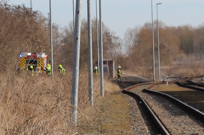 Hier war Ödland in Flammen aufgegangen. Ursache vermutlich durch Selbstentzündung, wie die Einsatzkräfte der Polizei vermuteten. Der Bahnverkehr der Hauptgleise waren durch die Einsatzmaßnahmen nicht beeinträchtigt.