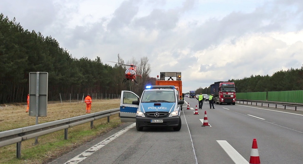 Der Kühllaster kam nach recht von der Fahrbahn ab und die Böschung (Grünstreifen) entlang, riss den Wildschutzzaun nieder, demolierte anschließend mehrere Waldbäume bis er letztendlich zum Stillstand kam. Am Unfallort kamen Ersthelfer (Vater und Sohn) sofort zur Hilfe und kümmerten sich um den verletzten Trucker bis die Rettungskräfte eintrafen. Zwei Polizeieinsatzfahrzeuge sicherten die Unfallstelle ab, damit auch der Rettungshubschrauber gefahrenlos auf den Grünstreifen landen konnte. Ein Bergungsunternehmen kümmerte nun um den verunfallten Kühllaster. Der Fahrer der vermutlich wegen gesundheitlichen Problemen die Kontrolle über den Laster verlor, wurde von einem Rettungshubschrauber in ein Krankenhaus gebracht.