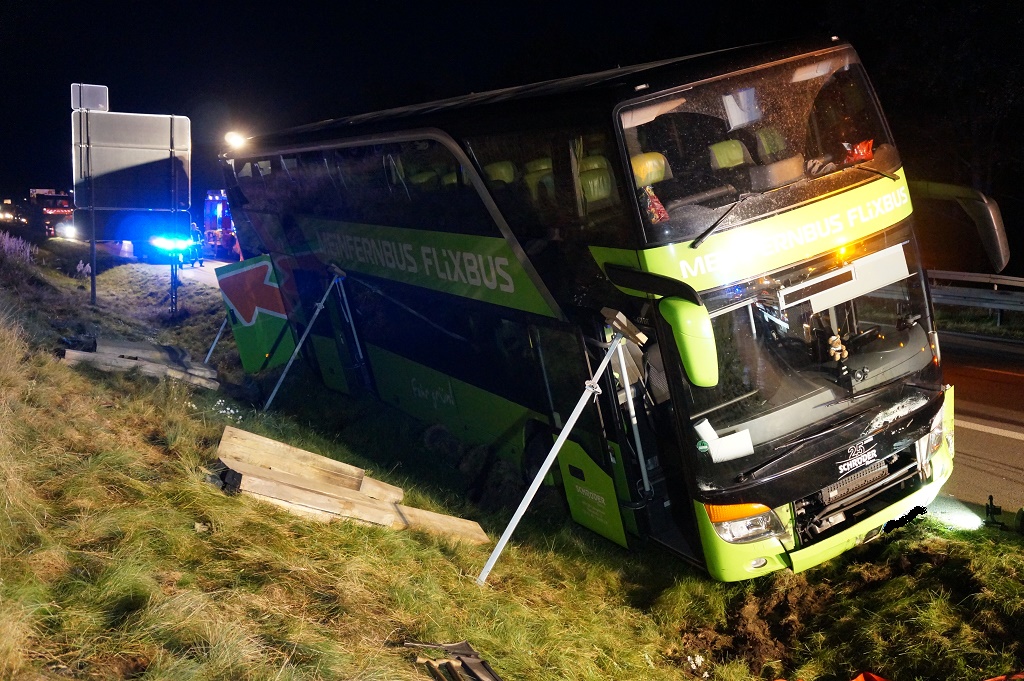 Da der Bus dort schief stand und drohte umzukippen, wurde er von Kameraden der Freiwilligen Feuerwehr stabilisiert. Der 52-jährige Busfahrer und der 52-jährige Ford-Fahrer wurden leicht verletzt und mussten ambulant im Krankenhaus behandelt werden. Die 53-jährige Beifahrerin des Pkw Ford musste aufgrund ihrer schweren Verletzungen stationär im Krankenhaus aufgenommen werden. Die Insassen des VW und die insgesamt 64 Fahrgäste des Busses blieben unverletzt. Der Fahrer des Reisebusses gab an, unter dem Einfluss von Medikamenten zu stehen. Demzufolge wurde eine Blutentnahme angeordnet und durchgeführt. Der Führerschein des Mannes wurde sichergestellt. Das Unternehmen des Reisebusses veranlasste die Bergung und stellte einen Ersatzbus für die Fahrgäste bereit. Die Richtungsfahrbahn Hamburg musste bis einschließlich 21.30 Uhr gesperrt werden. Für die Bergung des Busses wurde die Autobahn dann, nachdem sich der Stau abgebaut hatte, gegen 01.00 Uhr am 18.09.17 noch einmal für circa eineinhalb Stunde gesperrt. Hier wurde der Verkehr über die Anschlussstelle Herzsprung abgeleitet. Es entstand ein Sachschaden von etwa 60.000 Euro.