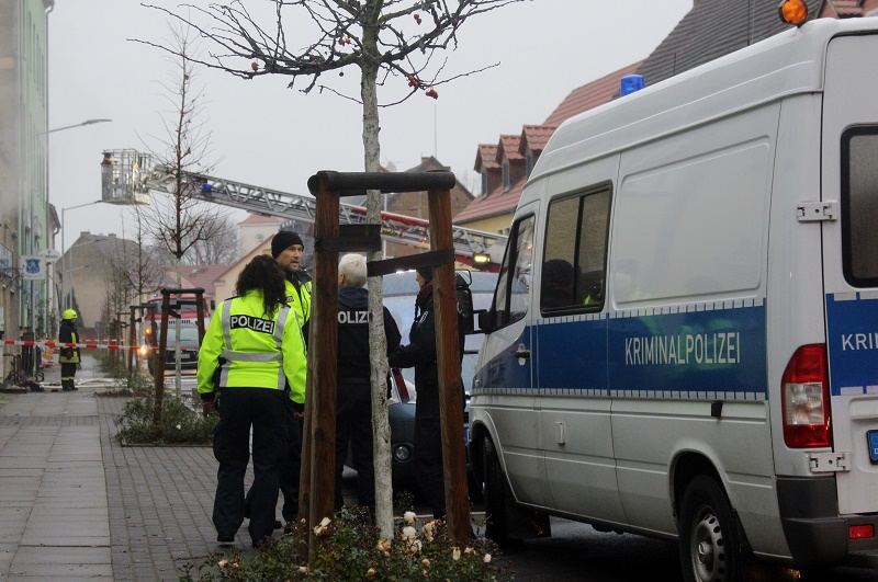 Die Berliner Straße in Freisack wurde längere Zeit für die Einsatzmaßnahmen gesperrt. Rauchentwicklung entwich immer wieder aus der betroffenen Wohnung. Zur Ursache wird nun ermittelt. Spezialisten der Kriminalpolizei sicherten am Tatort spuren.