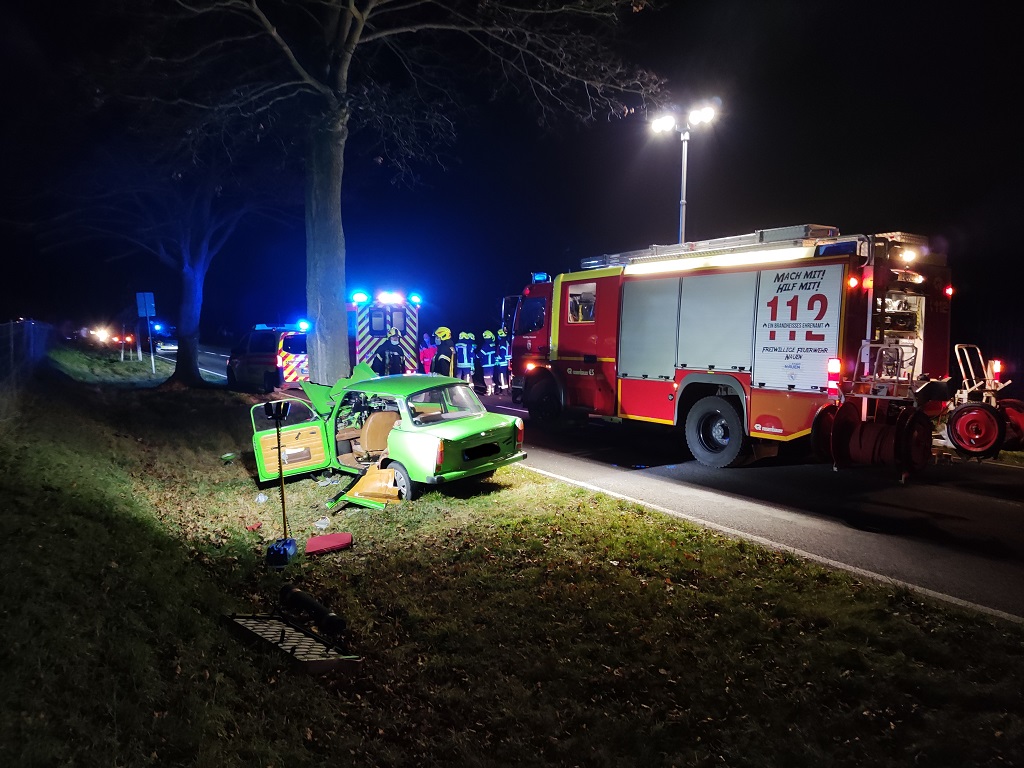 Havelland – Aus bislang noch unbekannter Ursache kam ein PKW Trabant (Oldtimer gebaut in der DDR) am Mittwochabend von Nauen kommend in Fahrtrichtung B5 Nauen-West nach links von der Fahrbahn ab und kollidierte nach 12 Meter mit einem Straßenbaum. Polizei, Feuerwehr der Stadt Nauen und Rettungskräfte kamen zum Einsatz. Der Fahrzeugführer (75) musste mit schwerem Gerät aus dem Fahrzeugwrack befreit werden. Der Rettungsdienst Havelland mit Notarzt kümmerten sich um die medizinische Erstversorgung, anschließend wurde der schwerverletzte in ein Krankenhaus gebracht.
