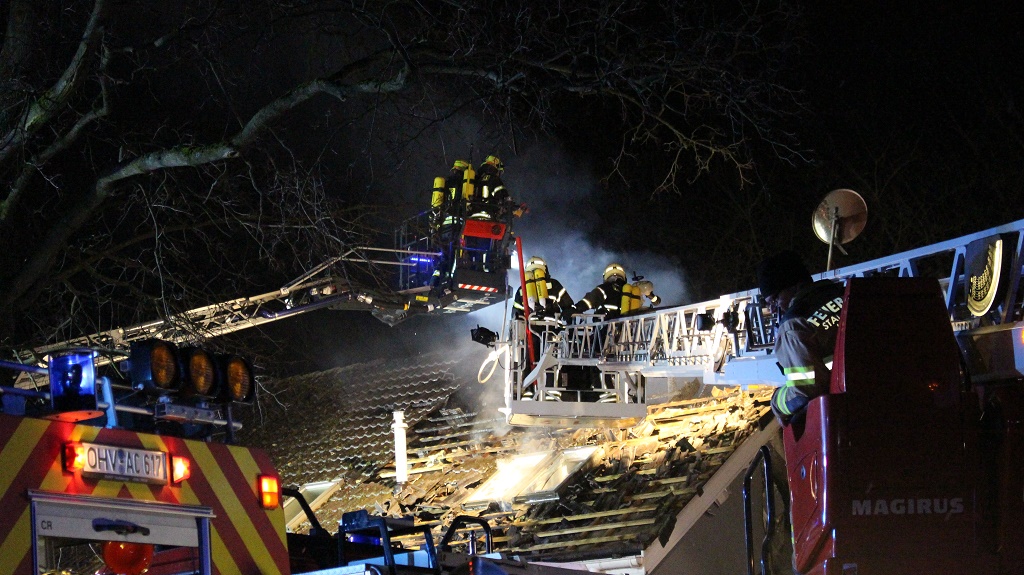 Video - Oberhavel - Erstmeldung - wie die Feuerwehr berichtet stand erst das Carport anschließend das Dachgeschoss der Doppelhaushälfte im OT Amalinienfelde im Vollbrand. Die Feuerwehr ist mit einem starken Kräfteaufgebot von 75 Kräften angerückt, zwei Drehleiterwagen wurden eingesetzt. Die Bewohner konnten das Haus gerade noch rechtzeitig verlassen.