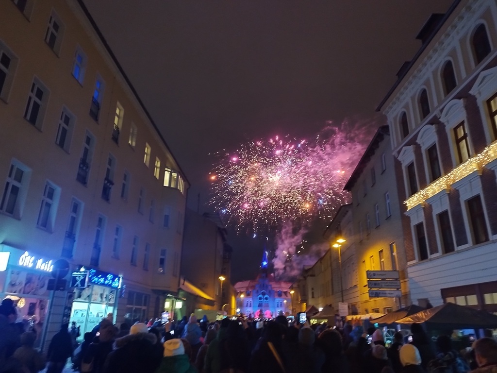 Nachtrag der Stadt Nauen zur Bilanz - Auch die zweite Auflage des „Nauener Rathausleuchten“ verlief am 3. Januar planmäßig. Schneeschauer, rutschige Straßen und Temperaturen knapp unter dem Gefrierpunkt waren für Tausende Besucherinnen und Besucher kein Hindernis, dem Spektakel rund ums Rathaus fernzubleiben. Bereits ab 15 Uhr konnte sich das Publikum beim bunten Programm vor dem Rathaus und reichlicher Kulinarik auf der angrenzenden Berliner Straße die Zeit verkürzen, bevor gegen 18:30 Uhr der Nauener Veranstalter Tobias Brudlo mit seinen vielen Unterstützern den roten Knopf für das eigentliche Spektakel drückte. Schillernde Laser-Effekte mit prächtigem Feuerwerk, untermalt von wummernden Techno-Beats: Das sind die Markenzeichen des „Rathausleuchtens“, das Tobias Brudlo zur festen Marke zum Jahresbeginn machen möchte.