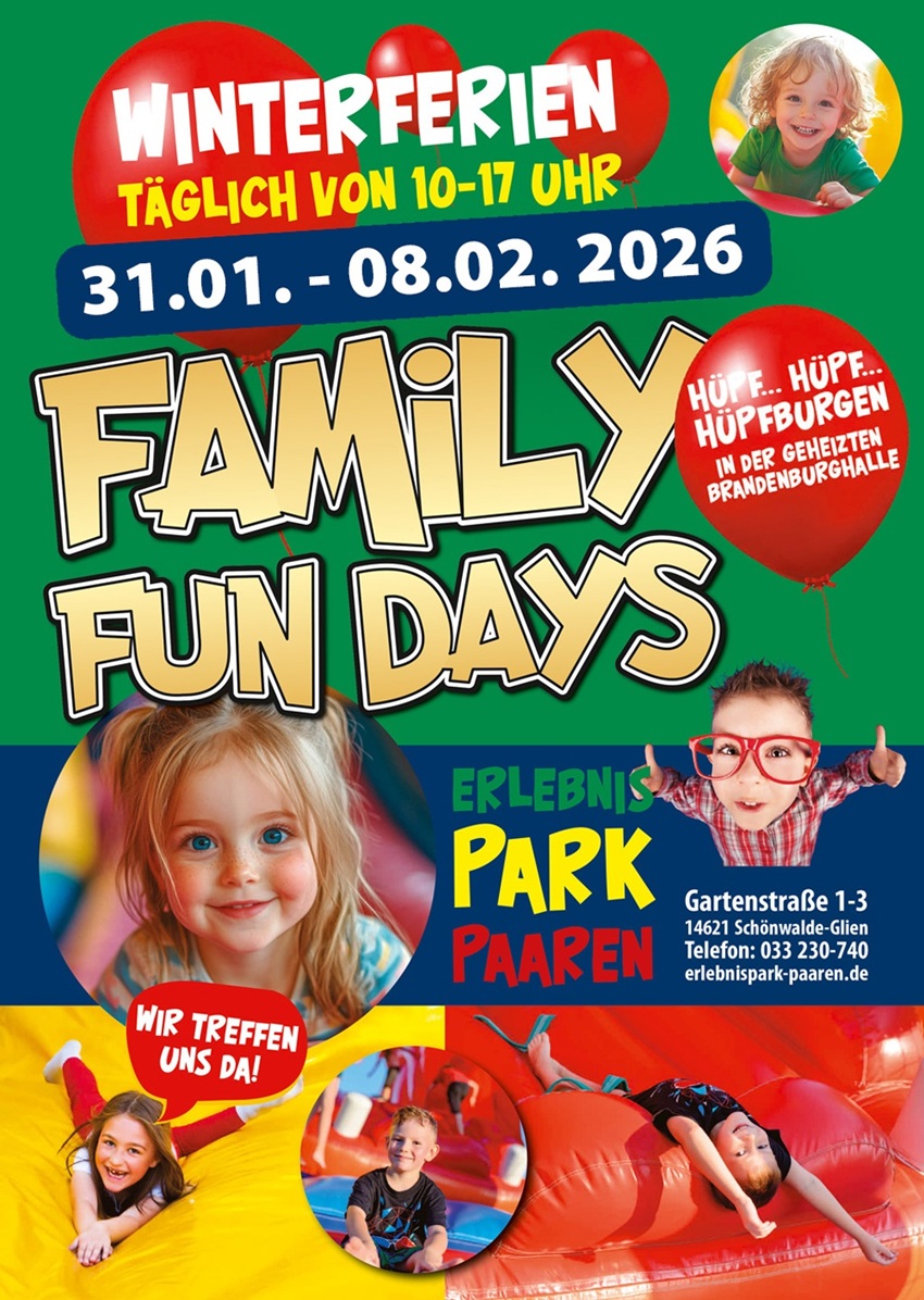 Spaß und Bewegung für die ganze Familie - Schönwalde-Glien: Vom 31. Januar bis 8. Februar von 10 bis 16 Uhr, laden die Family Fun Days im Erlebnispark Paaren zu einer willkommenen Auszeit ein. Hier können Sie gemeinsam entschleunigen mit Bewegung, Spiel und Spaß wieder aktiv werden.