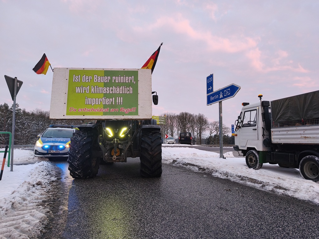 Und sie machten Ernst, Bauern blockieren heute sämtliche Zufahrten von Autobahnen. An der Anschlussstelle Kremmen (Oberhavel) sind seit etwa 7 Uhr morgens beide Zufahrten zur A24 in Richtung Berlin als auch Hamburg dicht. Es kam zeitweise zu Staubildungen.