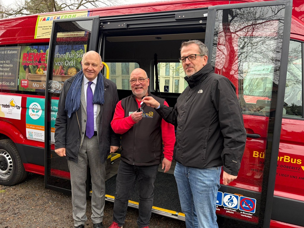 Am 31.03.2026 haben Landrat Roger Lewandowski und Bürgermeister Sven Richter gemeinsam einen neuen Bus an den Verein BürgerBus-Dallgow-Döberitz e. V. übergeben. Das Fahrzeug, welches künftig als Bürgerbus verkehren wird, ergänzt das Angebot der Havelbus Verkehrsgesellschaft wochentäglich auf der stark frequentierten Linie 670. In den vergangenen Jahren war die Nachfrage stetig gestiegen. Das Angebot des Bürgerbusses in dieser Gemeinde gibt es seit dem Jahr 2013. Das dafür genutzte Fahrzeug musste nun ersetzt werden.