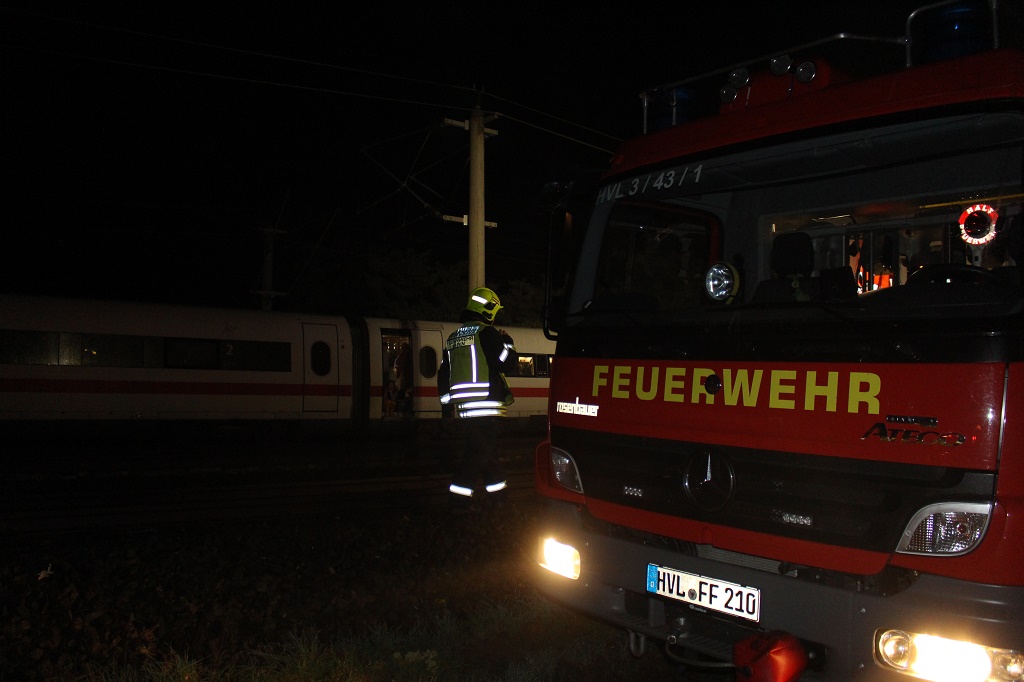 Havelland: Aufgrund einer Panne am ICE 552 kam es bei Nauen-Neugarten zu einem Zwangsstopp. Die Bundespolizei und Feuerwehr der Stadt Nauen kamen zur Unterstützung auf der freien Strecke zum Einsatz. Ein zweiter ICE kam nach längerer Wartezeit zum Ort, nach weiteren Stunden begannen in der ersten Nachthälfte die Evakuierungsmaßnahmen, Fahrgäste stiegen in den Ersatzzug.