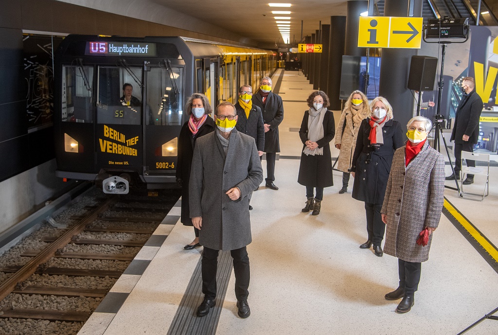 Am heutigen Freitag, den 4. Dezember 2020, haben die Berliner Verkehrsbetriebe (BVG) die neue Linie U5 in Betrieb genommen. Mit 22 Kilometern Streckenlänge zwischen Hönow und Hauptbahnhof ist sie ab sofort die zweitlängste U-Bahnlinie der Hauptstadt. Kurz nach 12 Uhr mittags hielten erstmals Züge mit Fahrgästen auf den beiden neuen U-Bahnhöfen Rotes Rathaus und Unter den Linden. Zuvor hatten Berlins Regierender Bürgermeister Michael Müller, BMVI-Staatssekretärin Dr. Tamara Zieschang und BVG-Vorstandsvorsitzende Eva Kreienkamp auf dem U-Bahnhof Unter den Linden die Bedeutung des „Lückenschluss U5“ für Berlin gewürdigt. Sie dankten dabei all denen, die am erfolgreichen Abschluss des Großprojekts mitgewirkt haben.