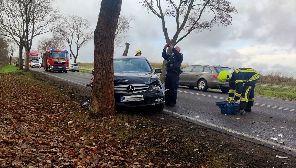 Landkreis Havelland – Ein PKW Peugeot musste verkehrsbedingt auf der Bundesstraße 5 zwischen Berge und Lietzow in Fahrtrichtung Berlin zum ansetzen, dieser Vorgang musste aufgrund des herrschenden Gegenverkehrs abgebrochen werden. Ein nachfolgender PKW Mercedes versuchte zwar noch rechtzeitig zu bremsen, dennoch kam es zur Kollision mit dem Peugeot, anschließend verriss der Fahrzeugführer im Mercedes das Lenkrad, sodass es zum Aufprall mit einem Straßenbaum kam. Polizei, Feuerwehr- und Rettungskräfte kamen zum Einsatz. Für die Dauer der Rettungsarbeiten und polizeilichen Maßnahmen musste die Richtungsfahrbahn Berlin gesperrt werden.