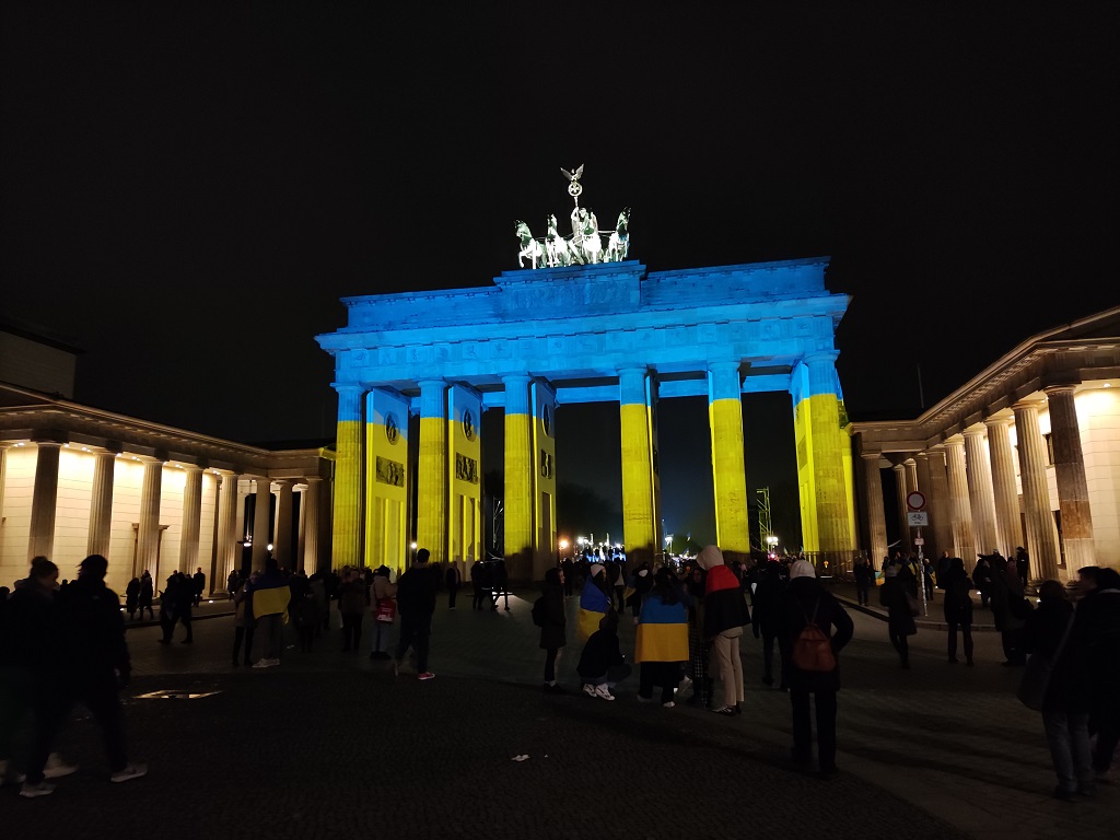 Tausende Menschen zeigte am Berliner Wahrzeichen, das in den ukrainischen Nationalfarben Blau/Gelb strahlte, ihre Solidarität mit der Ukrainischen Bevölkerung und gedachten der im Krieg gefallenen Soldaten und Zivilisten. Menschen trugen Ukrainische Flaggen Kinder mit Kerzen vor einem Panzer.