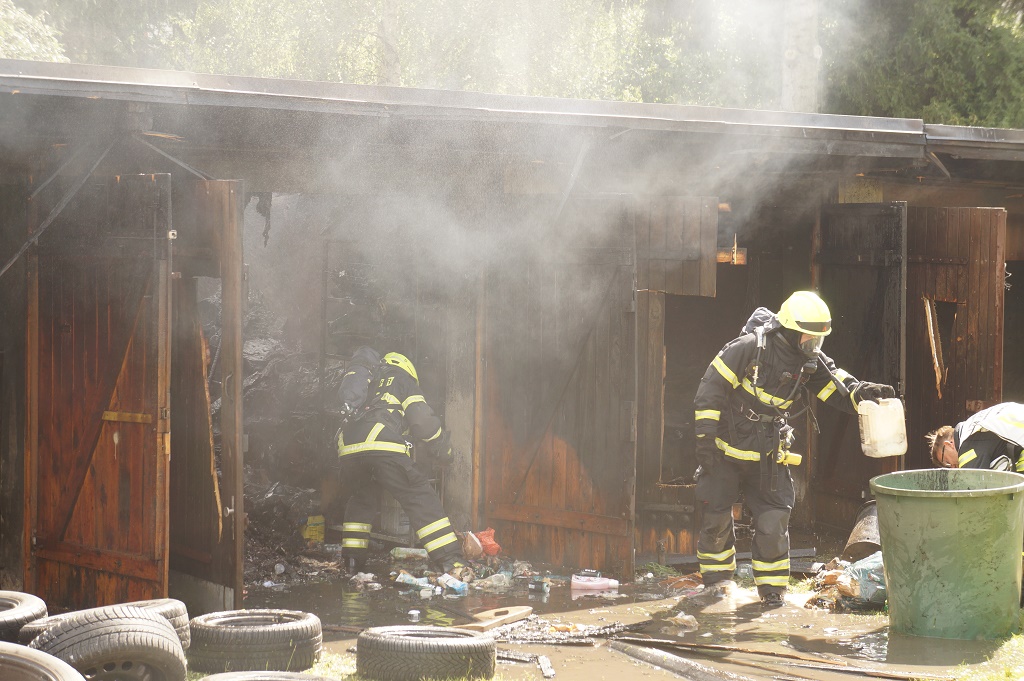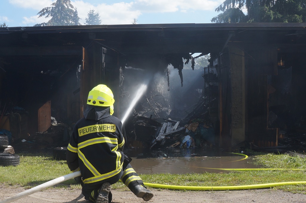 Feuerwehr räumt den verbrannten Inhalt aus den Garagen