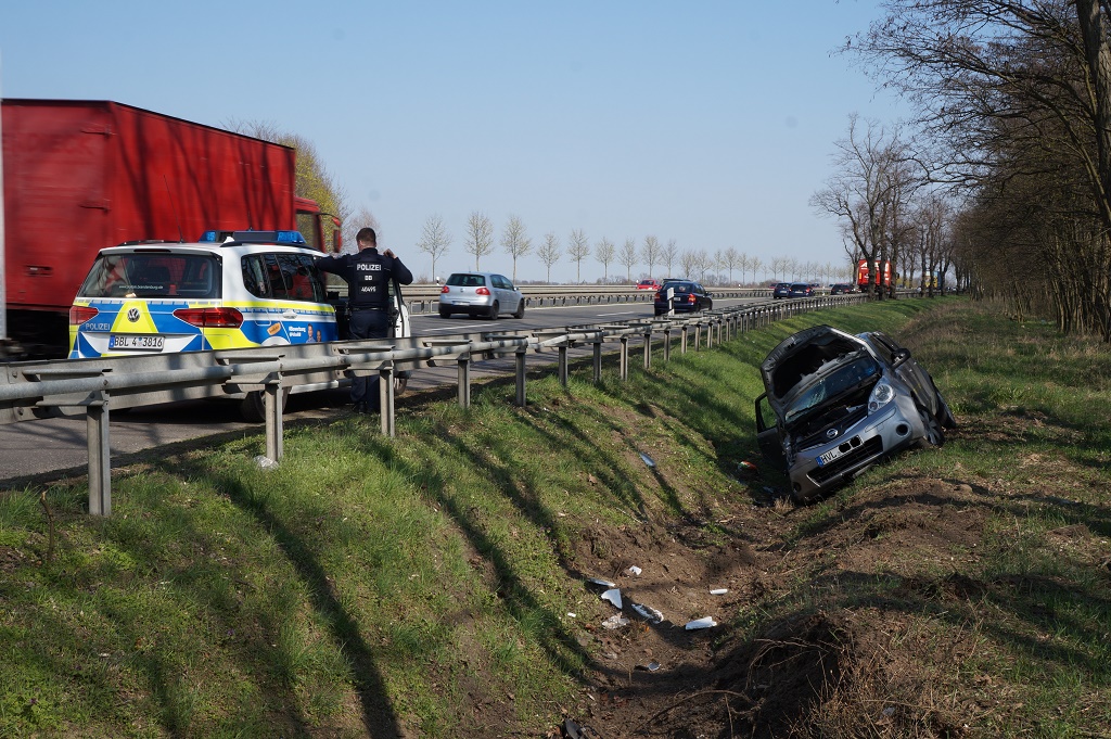 Dallgow-Döberitz OT Rohrbeck. Am Dienstagnachmittag kam es auf der B5 in Fahrtrichtung Berlin zu einem Verkehrsunfall wobei sich eine Autofahrerin mit ihrem Fahrzeug überschlug. Zum Unfallhergang kann bislang soviel gesagt werden, das unweit der Anschlussstelle Rohrbeck der PKW Nissan NOTE nach rechts von der Fahrbahn ab, fuhr auf die abgesenkte Leitplanke auf und durchfuhr in weiterer Folge einen 2 Meter tiefen Graben, auf einer Länge von ca 50 Metern.