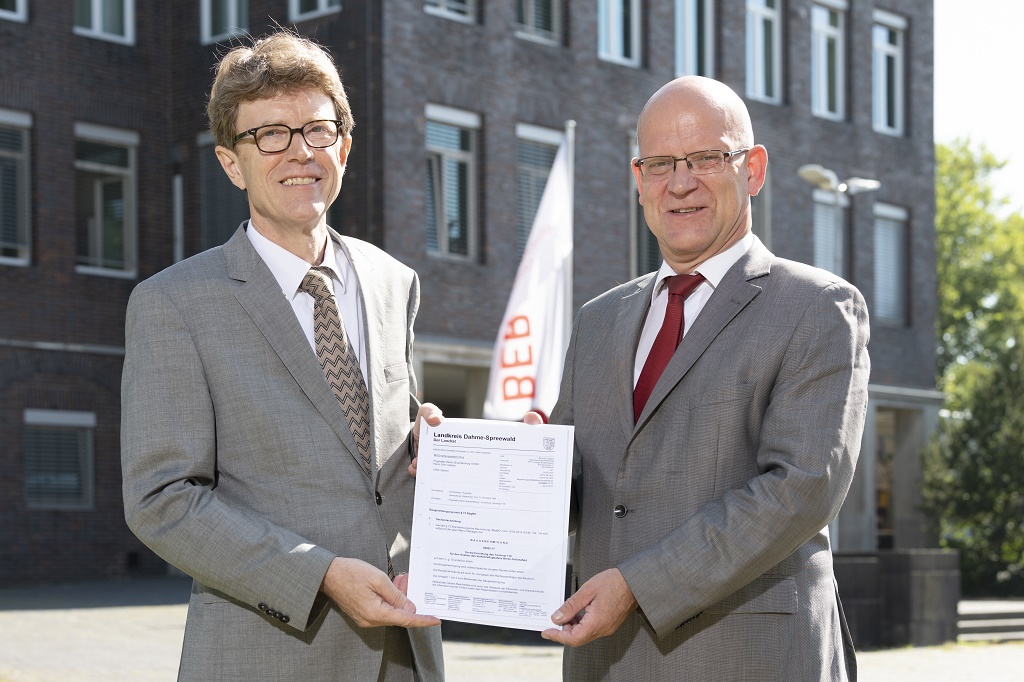 Das Bauordnungsamt (BOA) des Landeskreises Dahme-Spreewald hat heute der Flughafen Berlin Brandenburg GmbH die Baugenehmigung für das BER-Terminal T2 (frühere Bezeichnung T1E) erteilt. Landrat Stephan Loge übergab die Genehmigung in Schönefeld an Flughafenchef Prof. Dr.-Ing. Engelbert Lütke Daldrup. Das Gebäude wird direkt vor dem Pier Nord errichtet und ist ein wichtiger Bestandteil des Masterplans BER 2040.