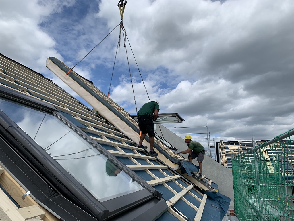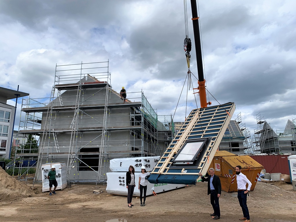 Mit einem großen Kran wurden die vorproduzierten, tonnenschweren Dachelemente direkt vom Lkw auf die Häuser gehievt. „Mit dem Bauprojekt wird der Ansatz vorangetrieben, bezahlbares Wohneigentum für junge Familien mit Kindern in Nauen zu schaffen, das sowohl ökonomisch als auch ökologisch nachhaltig ist“, sagte Dr. Lehmann am Rande der Veranstaltung.