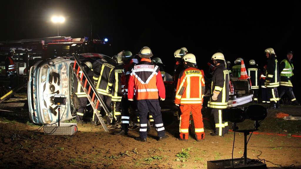 Die Feuerwehrkräfte treffen ein und versuchen der Lage her zu werden. Ein PKW brannte zwei weitere waren zusammengestoßen wobei ein Fahrzeug auf die Seite lag. Die Rettungskräfte der Feuerwehr setzten zur Personenrettung Spreizer und Schere ein. Ein weiteres Team musste Löschmaßnahmen durchführen. Personenin eingeklemmter Lage, mussten schnellstmöglich gerettet werden. Die Übung heute war zwar für die Wehren der Gemeinde Glien nur im kleinen Rahmen dennoch sehr lehrreich, denn es war auch von großer Wichtigkeit zu prüfen wie schnell die Einsatzfahrzeuge der Gemeinde nach dem Alarm am Ereignisort sind. Dies klappte heute gut, wie die Feuerwehr am Übungsort berichtete. Auch ist man am Ort mit dem Übungsverlauf recht zufrieden gewesen, obwohl Fehler selbst den Wehrkräften passieren können, das bleibt nicht aus, berichtete einer der Einsatzleiter. Der Rettungsdienst Havelland setzte ein Rettungswagen für die Scheinverletzten ein.