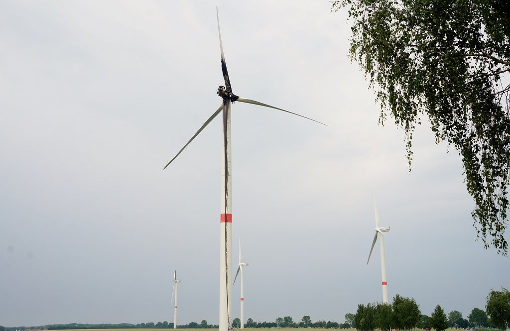 Oberhavel - Zu einem Feuerwehreinsatz wegen eines brennenden Windrates kam es heute im Amt Gransee. Ein Blitzeinschlag von einer Unwetterfront traf das Windrat bei Altlüdersdorf und löste somit einen Brand im Motorbereich aus. Die Flammen umschlungen die Mechanik und auch die Flügel.