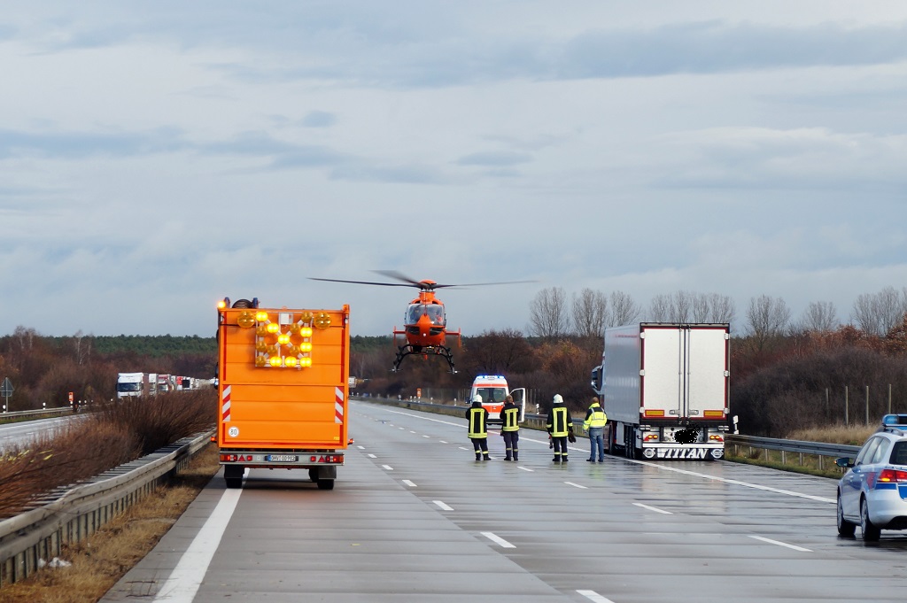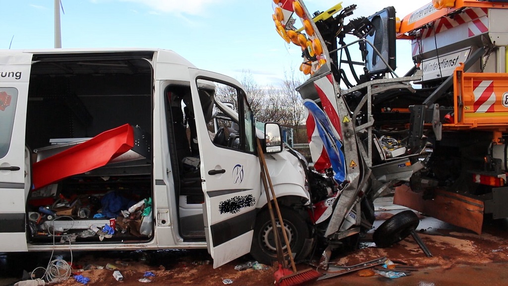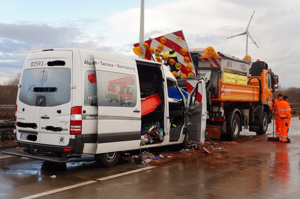 Landkreis Potsdam-Mittelmark, Bundesautobahn 9, AS Brück-AS Beelitz - Schwerer Verkehrsunfall Montag, 03.12.2018, 09:23 Uhr - Nach derzeitigen Erkenntnissen fuhr am heutigen Morgen im Bereich einer Wanderbaustelle in Fahrtrichtung Berlin ein Kleinlasttransporter mit hoher Geschwindigkeit auf einen Schilderwagen der Autobahnmeisterei auf.