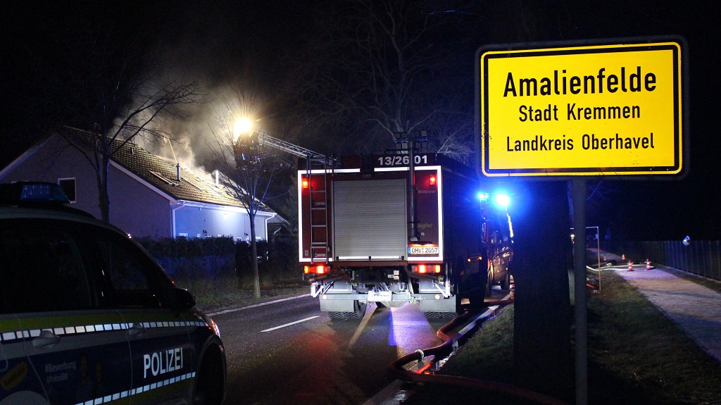 Nachtrag - Wohnhaus unbewohnbar Kremmen – Im Ortsteil Amalienfelde geriet aus bislang unbekannter Ursache ein Schuppen in der Berliner Chaussee in der vergangenen Nacht in Brand. Die Flammen griffen in der Folge auf das angrenzende Wohnhaus über, wodurch der Dachstuhl vollständig niederbrannte. Das Wohnhaus ist derzeit nicht mehr bewohnbar. Die nach bisherigen Erkenntnissen unverletzten Bewohner des Hauses mussten anderweitig untergebracht werden.