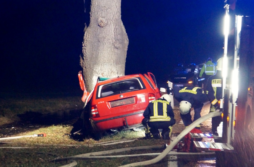 Potsdam-Mittelmark - Erstmeldung - wie aktuell bekannt ist, kam es am frühen Dienstagabend zu einem folgen schweren Verkehrsunfall auf der Ortsverbindung Trechwitz und Schenkenberg (Kloster Lehnin). Aus noch unbekannter Ursache war der PKW Skoda im Bereich 70 km/h vermutlich mit überhöhter Geschwindigkeit von der Fahrbahn abgekommen und frontal gegen ein massiven Baum geprallt.