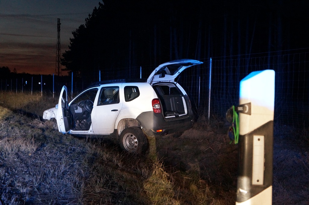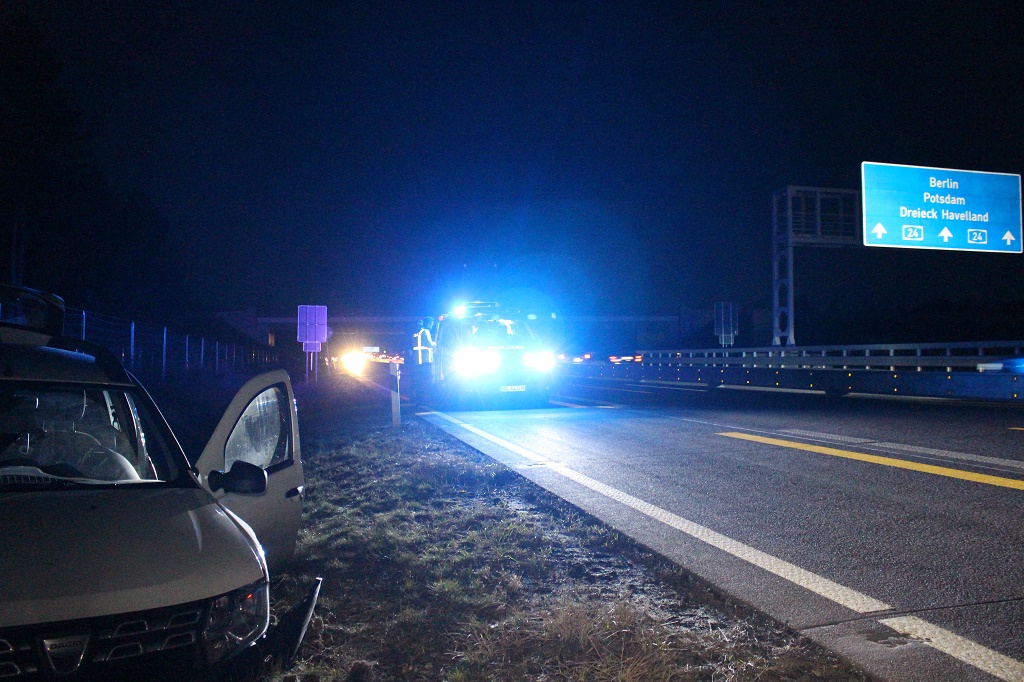 Kreis Oberhavel - Kurzmeldung: Aus bislang noch ungeklärter Ursache prallte an der Anschlussstelle Kremmen in Fahrtrichtung Hamburg ein PKW Dacia Duster ins Heck eines Ford, durch des Aufpralls kam der Dacia nach rechts von der Fahrbahn ab und durchfuhr auf einer Länge von über 40 Meter den Straßengraben bis er zum Stehen.