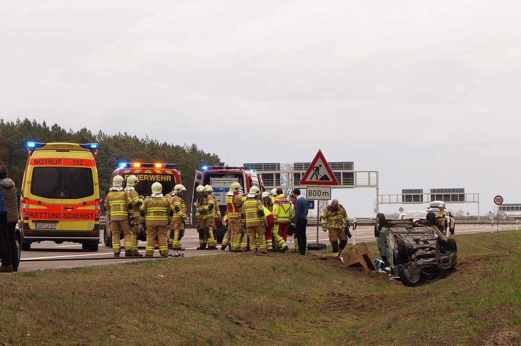 Erstmeldung – am Sonntagmittag ist ein PKW Honda jazz im Dreieck Havelland (Gebiet Kremmen) zwischen dem AD Havelland und der Anschlussstelle Oberkrämer mit einem Fahrzeug kollidiert, der Honda kam, ins Schleudern und überschlug sich und landet anschließend im Graben auf dem Dach. Das Fahrzeug hatte dabei ein Betonsockel eines Verkehrsschildes aus dem Boden gerissen. Am Ort kümmerten sich Ersthelfer um die Schwerverletzt, Insassen, einer der Helfer war ein Angehöriger der Berliner Feuerwehr.