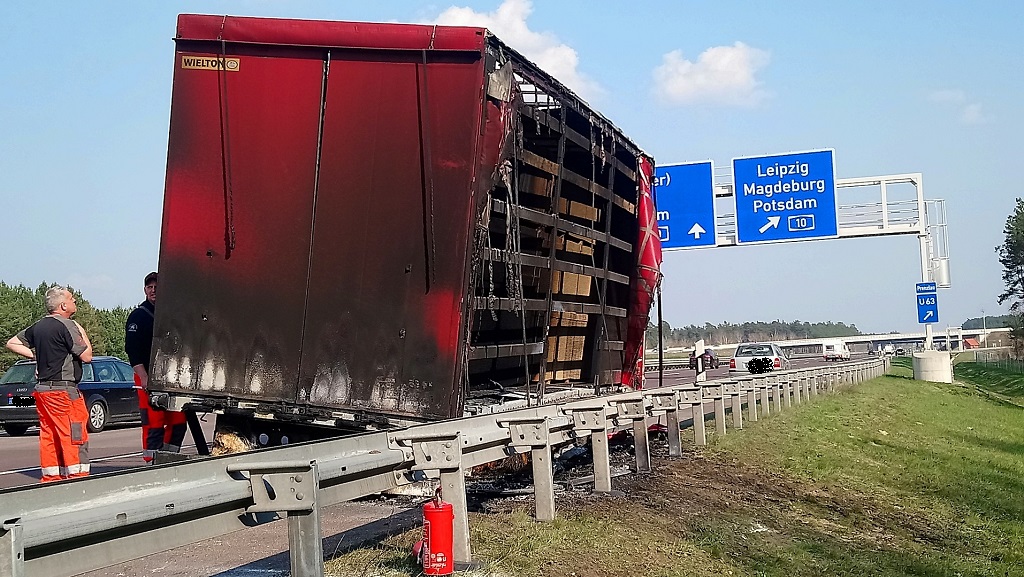 Oberhavel – Wegen eines brennenden LKW-Auflieger auf der A24 im Dreieck Havelland kam es am Samstag zu mehrfach kurzzeitigen Sperrungen in Fahrtrichtung Berlin. Der Auflieger hatte mehrere OSB-Holplatten (Grobspannplatten) geladen. Die Feuerwehr gelang es durch schnelles Eingreifen, das komplette abbrennen dem LKW-Anhänger zu verhindern. Es musste während der Löscharbeiten zeitweise die Richtungsfahrbahn Berlin gesperrt werden. Eine Bergungsfirma (Jänicke) kümmerte sich anschießend um den schwer- zerstörten Auflieger.