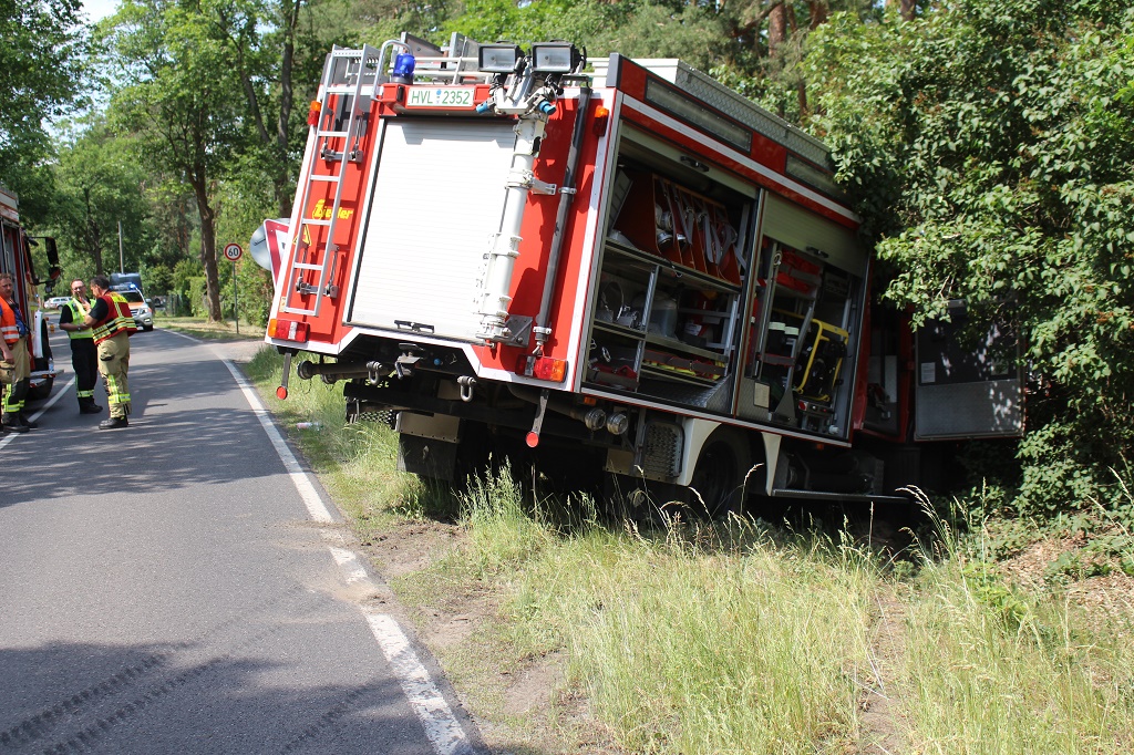 Landkreis Havelland, Landesstraße 201, zwischen Alt-Brieselang und dem Abzweig nach Brieselang - Unfall eines Feuerwehrfahrzeugs- Dienstag, 03. Juni 2019, 12:40 Uhr - Am Dienstagmittag kam ein Tanklöschfahrzeug der Feuerwehr auf der L201 von der Fahrbahn ab. Das Einsatzfahrzeug war zur Nachaufsicht und Brandbekämpfung in Richtung des Wald- und Heidebrandes vom Vortag an der A10 unterwegs. Bei der Fahrt mit Blaulicht überholte die Feuerwehr mehrere PKW, als plötzlich eine 69-Jährige mit ihrem Wagen zum Überholen ausscherte.
