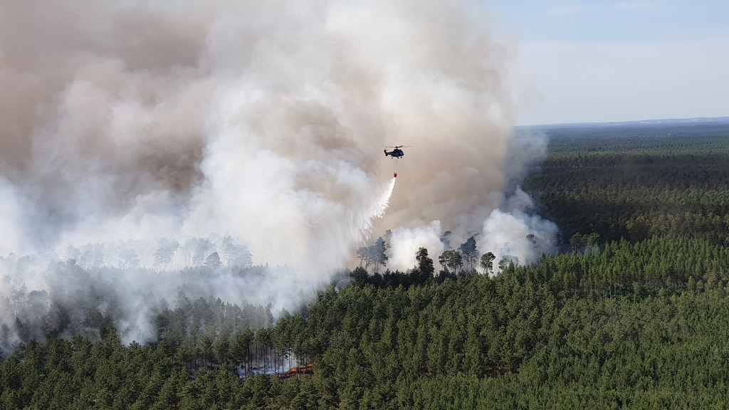 Brandenburg / Lieberoser Heide (ots) Der Brandherd in der Lieberoser Heide hat sich seit gestern von 5 Hektar auf 100 Hektar erweitert. Aus diesem Grund setzt die Bundespolizei ab heute neben dem mittleren Transporthubschrauber "Super Puma" zusätzlich einen leichten Transporthubschrauber (H155) mit einem Feuerlöschbehälter mit einem Fassungsvermögen von knapp 800 Litern ein.