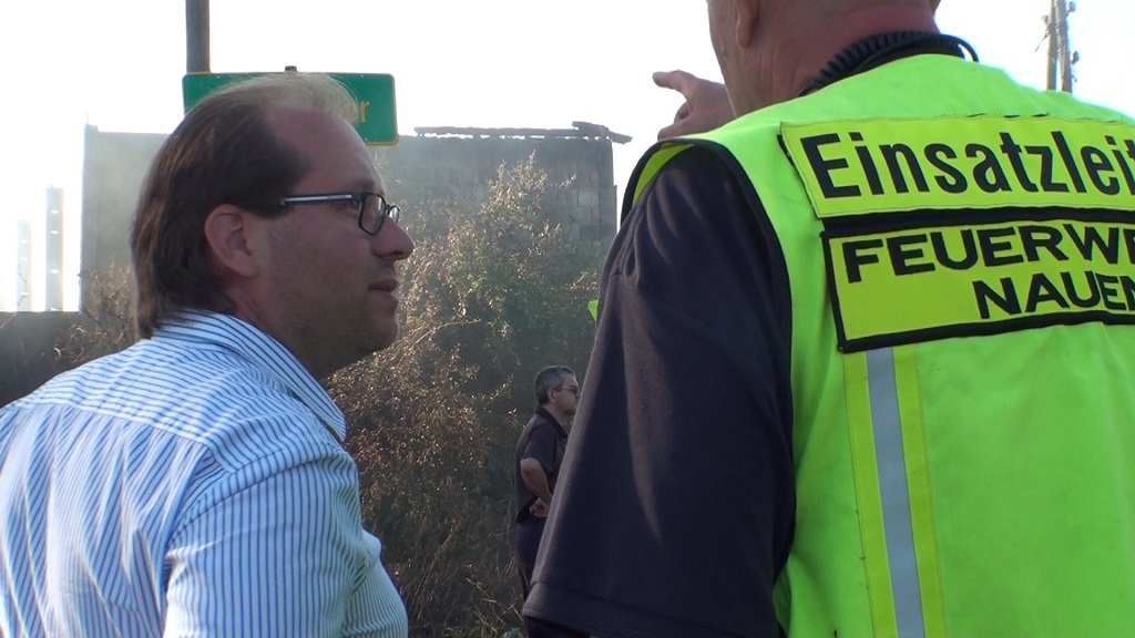 Weiterhin herrscht am Ort starke Rauchentwicklung. Die Polizei hat die Landstraße erneut gesperrt, damit die Einsatzkräfte am Brandort sicherer arbeiten können. Es gibt dennoch immer wieder uneinsichtige Bürger bzw. Radfahrer die trotz Absperrband in die Einsatzstelle reinfahren und damit sich selbst und andere Personen gefährden. Der Nauener Bürgermeister Manuel Meger (LWN) verschaffte sich heute einen eigenen Eindruck vom Brandort und ließ sich vom Stadtbrandmeister Jörg Meyer die aktuelle schildern. Von dem Brand sich wohl vier Flachgebäude mit Stroh betroffen. Die Polizei schilderte den Sachschaden auf 650.000 Euro.