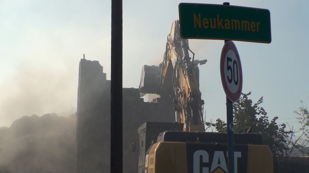 Ein Tag nach dem Großfeuer bei Nauen ist immer noch keine Beruhigung eingetreten. Die Feuerwehr Nauen musste heute Morgen noch einmal mit einem starken Kräfteaufgebot ausrücken, die Nachlöscharbeiten werden sich wohl noch mindestens bis in den Abend hinziehen. Die Einsatzkräfte am Ort werden aber nun von einem bagger unterstützt, der riss Gebäudeteile ein damit die Löscharbeiten intensiviert werden können.