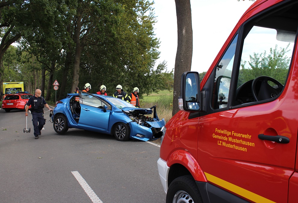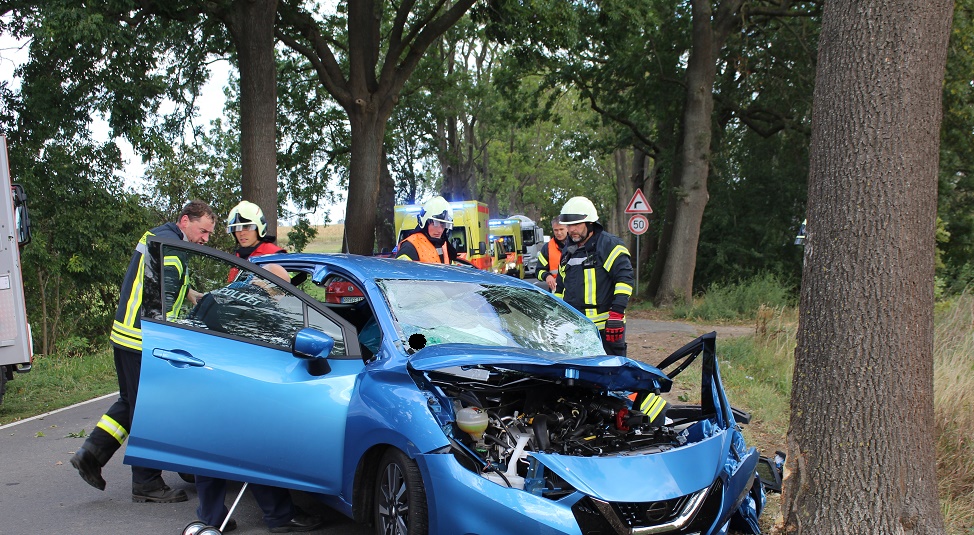 Ostprignitz-Ruppin - Ein Ehepaar ist heute Nachmittag auf der Kreisstraße bei Wusterhausen/Dosse vor Ortseingang Lögow im Überholvorgang verunglückt. Der PKW Nissan prallte frontal gegen einen Baum. Die Feuerwehr musste beide Insassen aus dem Fahrzeug befreien. Die Straße musste bis zum Ende der Bergungsarbeiten gesperrt werden. Das Nissan Kleinwagen wurde bei dem Crash völlig zerstört. In den Bereich sind nur 70 km/h zugelassen.