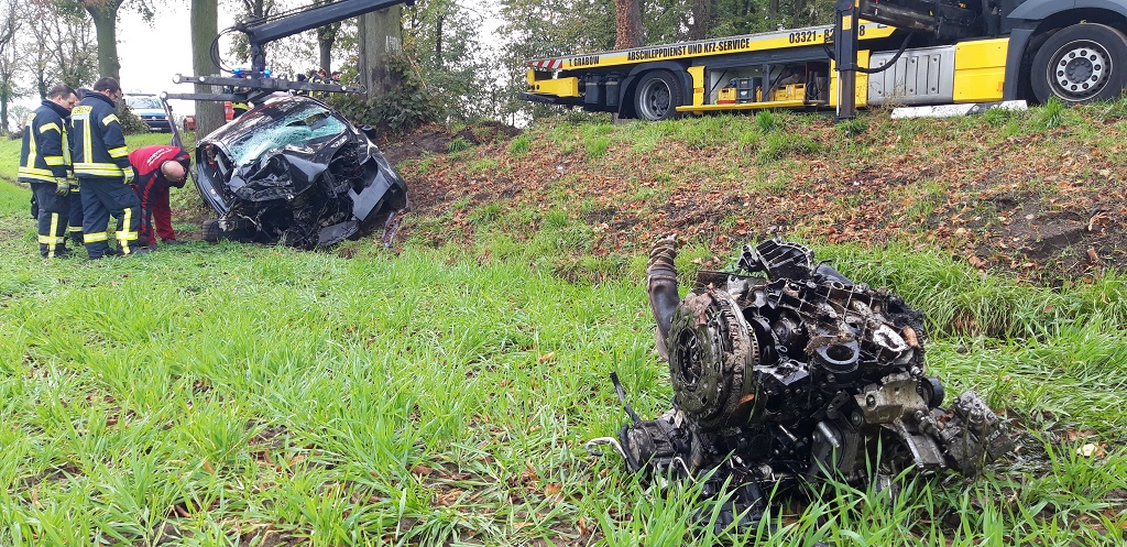 Die Baumkollisionen waren so heftig das der gesamte Motorblock und die aus dem Skoda herraus geschleudert wurden. Aufgrund der noch andauernden aufwendigen Reinigungsarbeiten, da die Straße komplett Betriesbstoffe übersät ist, bleibt die Landstraße zwischen Ketzin-Havel und Vorketzin bis auf weiteres gesperrt.