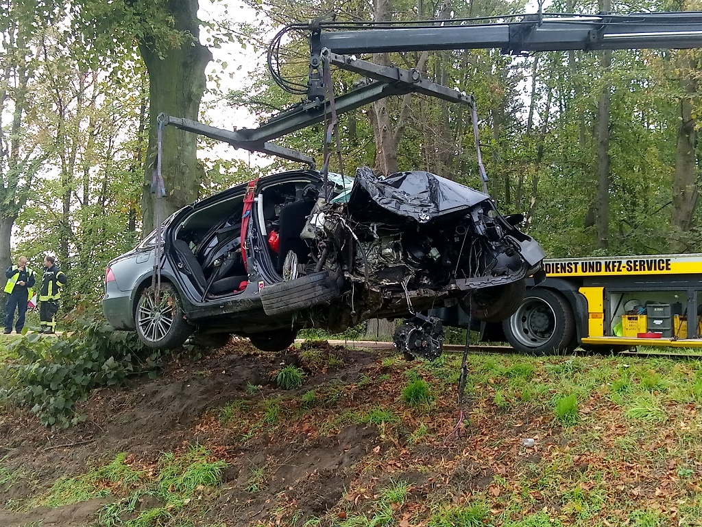 Erstmeldung: Zu einem schweren Unfall kam es am Sonntagvormittag auf der Landstraße bei Vorketzin. Der PKW Skoda kam vermutlich bei überhöhter Geschwindigkeit auf nasser und unebener Straße nach rechts von der Fahrbahn ab, prallte gegen zwei Straßenbäume wurde dabei in die Gegenfahrspur katapultiert, bis er völlig zerstört in der Straßenböschung zum Stillstand kam.