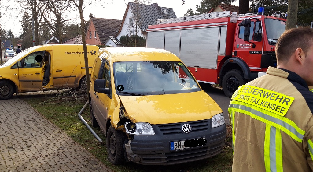 Nachtrag - Falkensee, Moselstraße Auto kommt von Fahrbahn ab und überschlägt sich - Mittwoch, 29.01.2020, 13:25 Uhr - Die 21-jährige Fahrerin eines PKW VW Caddy befuhr am Mittwoch zur Mittagszeit die Moselstraße in Richtung Ringpromenade. Dabei kam sie aus noch ungeklärter Ursache nach rechts von der Fahrbahn ab und kollidierte mit einem Baum und einem Straßenpfeiler. Durch die Wucht des Aufpralls kippte der PKW auf das Dach.