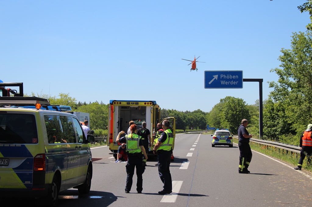 Bei einem zweiten Unfall auf Höhe der Anschlussstelle Phöben, verunglückte ein Motorradfahrer in einer 10-köpfigen Gruppe, er verletzte sich hierbei schwer. Ein Hubschrauber unterstützte die Rettungskräfte. Die Richtungsfahrbahn AD Werder/Havel wurde dafür komplett gesperrt. Ein kam dabei zu noch längeren Rückstau. Nach Beendigung der Rettungsarbeiten wurde der schwerverletzte in ein Krankenhaus geflogen.