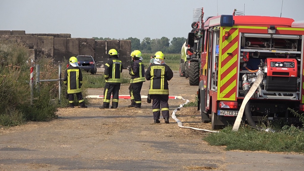 Nachtrag:18.04 Uhr / Wie die Feuerwehr vor Ort mitteilte brannten etwa 240 Ballen Stroh. Die Strohmiete wird im weiteren Verlauf kontrolliert herunter brennen.