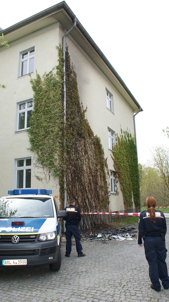 Außerdem ist ein Wachschutz vor Ort tätig. Im Rahmen dieser Bestreifung stellten die zwei handelnden Polizisten ein Fahrzeug Renault Clio in dem ansonsten in der Nacht wenig frequentierten Gebäudekomplex fest. Als die Fahrzeuginsassen einer Kontrolle unterzogen werden sollten, flüchtete das Fahrzeug. Nach nur wenigen Metern der Flucht fuhr sich der Fahrer in einem Sandhaufen fest, stieg aus dem Fahrzeug und lief in ein nahes Waldstück. Trotz sofortiger Verfolgung und Einsatz eines Polizeihubschraubers konnte er nicht mehr festgestellt werden. Der Beifahrer, ein 23-jähriger aus dem Landkreis Teltow-Fläming, konnte noch am Ort durch die Polizei festgehalten werden, das Fahrzeug war auf eine Verwandte von ihm zugelassen. Noch während der Maßnahmen bemerkten hinzugerufene Polizisten einen Feuerschein nahe eines der derzeit leerstehenden, mehrstöckigen Gebäudes und nur ca. 100 m vom ehemaligen Standort des PKW Renault entfernt. Bei der Nachschau wurden drei große Abfallcontainer (Papier, Restmüll und Wertstoffe) aus Plastik festgestellt, die zu diesem Zeitpunkt bereits in fast voller Ausdehnung brannten. Die Polizisten löschten den Brand mithilfe mehrerer Feuerlöscher. Da die drei Container nahe der Giebelseite standen, wurde die Fassade der Giebelseite mit Ruß verschmutzt. Weitere Schäden am Gebäude waren vorerst nicht sichtbar. Eine genaue Untersuchung wurde jedoch veranlasst. Der 23-Jährige wurde nunmehr unter dem Verdacht der versuchten Brandstiftung vorläufig festgenommen. Bei der Durchsuchung des Fahrzeugs (Renault) wurden verbotene polnische Feuerwerkskörper, Streichhölzer, Brandbeschleuniger und Plakate mit fremdenfeindlichen Sprüchen aufgefunden. Der Mann ist der Polizei weiterhin als Sympathisant der rechtsextremen Szene bekannt. In seiner Beschuldigtenvernehmung ließ er sich zu der aktuellen Brandlegung ein. Weitere Ermittlungen ergaben Hinweise auf den zuvor geflüchteten Fahrer, welcher von der Polizei ebenfalls der rechtsextremen Szene zugeordnet wird. Auch er konnte am Nachmittag an seinem Wohnort vorläufig festgenommen werden. Bei ihm handelt es sich um einen 32-Jährigen aus dem Landkreis Teltow-Fläming. Derzeit werden Durchsuchungen bei den beiden Tatverdächtigen durchgeführt. Die Polizei hat eine BAO (Besondere Aufbauorganisation) unter der Führung des stellvertretenden Direktionsleiters, Leitender Polizeidirektor Michael Scharf, mit Spurensicherungsspezialisten, Kriminalisten und Durchsuchungskräften eingerichtet, um die Tat vollständig aufzuklären. Innenminister Karl-Heinz Schröter verurteilte den versuchten Brandanschlag scharf. Zugleich dankte er der Polizei für ihre Aufmerksamkeit und ihr konsequentes Eingreifen. „Unsere Polizei hat wieder einmal hervorragend gearbeitet. Es ist der Aufmerksamkeit unserer Polizisten zu verdanken, dass kein größerer Schaden entstanden ist. Sie haben vor Ort einen Tatverdächtigen festnehmen können und gemeinsam mit dem Wachschutz das gelegte Feuer rasch gelöscht: Ich beglückwünsche unsere Polizei, dass sie auch den zweiten Tatverdächtigen innerhalb weniger Stunden ermitteln und festnehmen konnte. Unsere Polizei wird konsequent gegen diesen braunen Sumpf vorgehen“, sagte der Minister. Er betonte: „Menschen in Not werden weiter eine sichere Zuflucht in unseren Land erhalten. Daran werden auch rechtsextremistische Brandstifter nichts ändern. Nicht sie, sondern diejenigen, die den Flüchtlingen in unserem Land hilfreich zur Seite stehen, sind repräsentativ für das Land. Brandenburg ist und bleibt ein tolerantes und weltoffenes Land. Die Tatverdächtigen müssen jetzt rasch angeklagt und vor Gericht gestellt werden. Sie müssen die ganze Härte des Gesetzes zu spüren bekommen.“