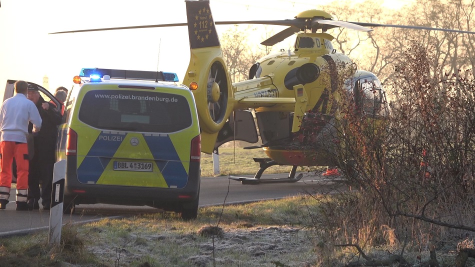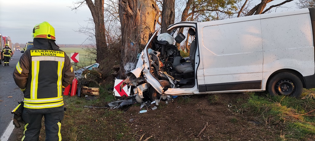 Havelland: Aus bislang noch unbekannter Ursache ist heute Morgen ein Kleintransporter aus Fahrrichtung Brandenburg/Havel kommend in Fahrtrichtung Nauen im Kurvenbereich nach rechts von der Fahrbahn abgekommen durch den Grünstreifen und prallte anschließend gegen eine massive Baumgruppe. Der Fahrer erlitt schwere Verletzungen, ein Rettungshubschrauber (ADAC) brachte ihn in ein Krankenhaus. Die Einsatzkräfte mussten am Ort zwei Bäume zur Sicherheit fällen.